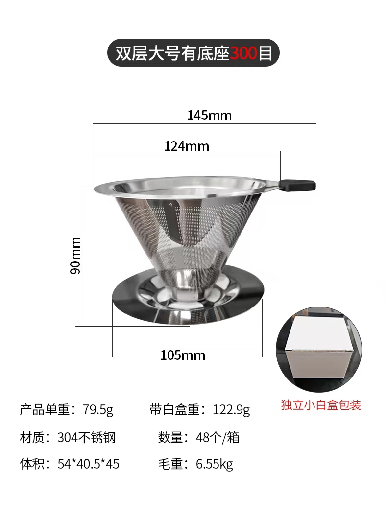 Product weight per unit: 79.5gMaterial: 304 stainless steelVolume: 54 * 40.5 * 45Weight with white box: 122.9gQuantity: 48 pieces/boxGross weight: 6.55kg